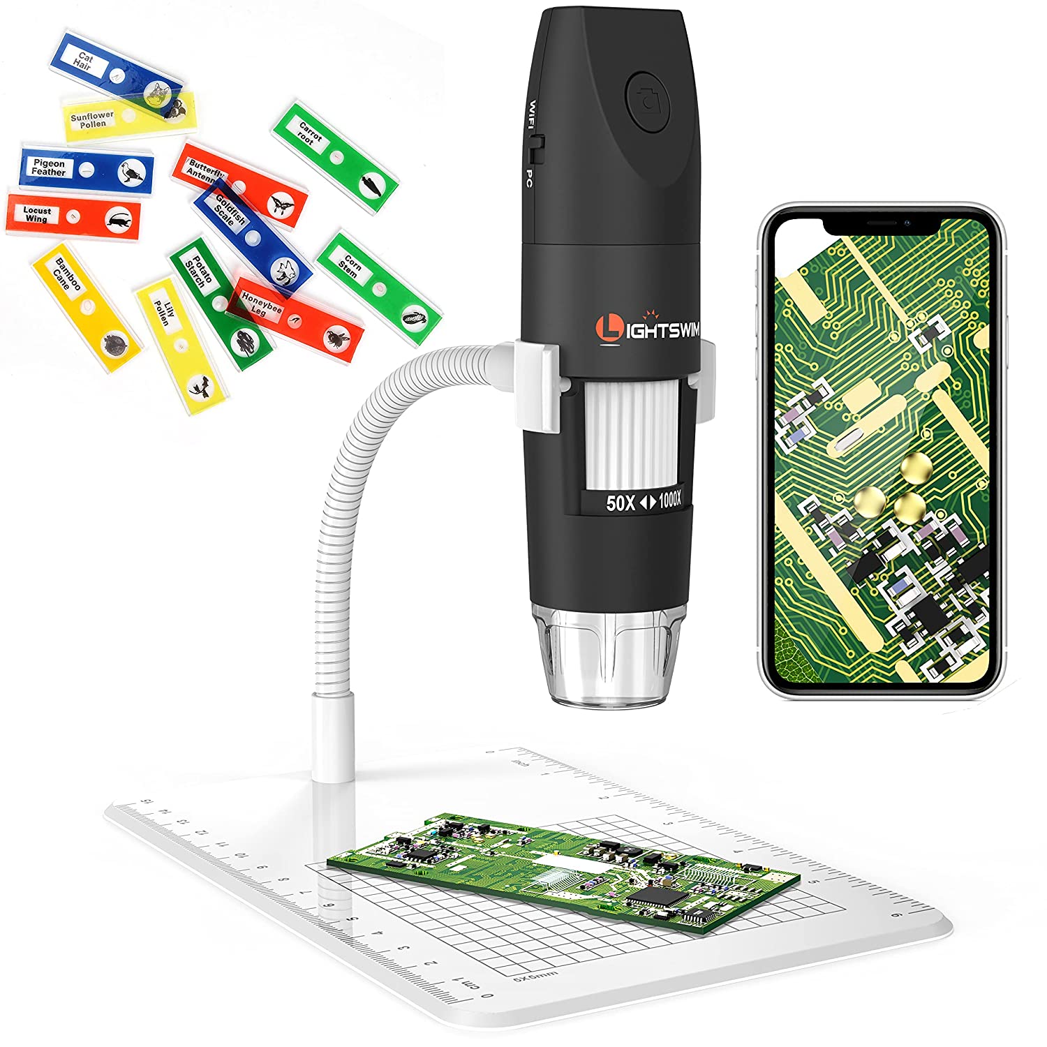 Microscópio digital sem fios, Lightswim 50 ~ 1000 x, com câmara HD 1080P 2MP, 8 luzes LED