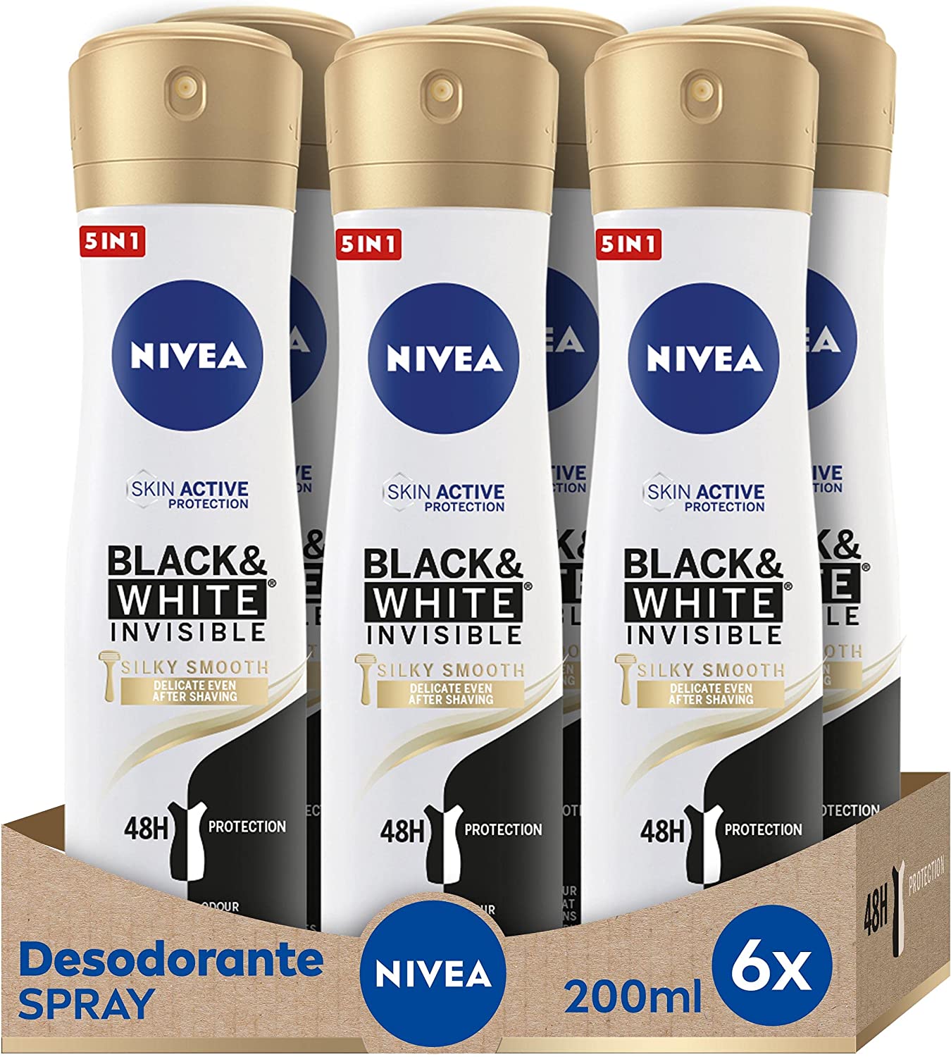 NIVEA Black & White Invisible Silky Smooth Spray Embalagem com 6 (6 x 200 ml), desodorizante antitranspiração para uma pele lisa, desodorante em spray que protege a roupa -