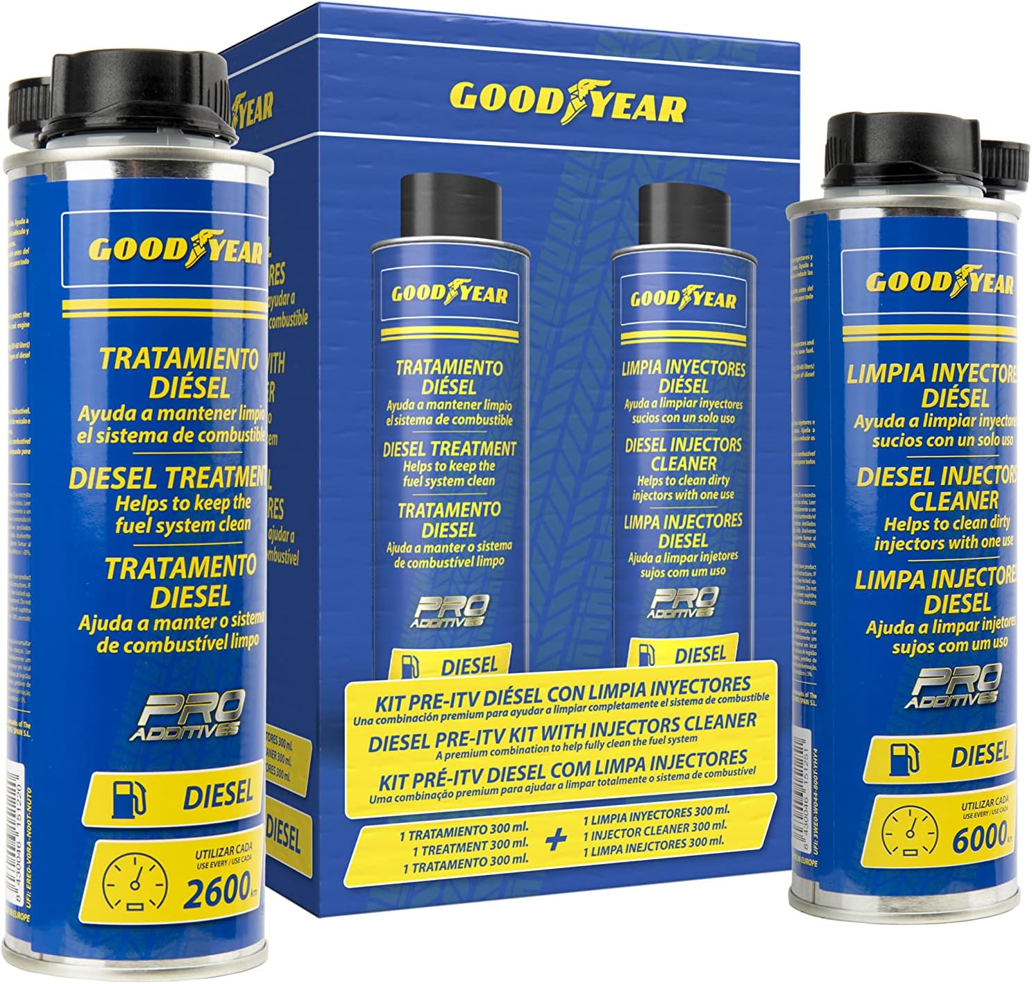 Goodyear Kit Pré-ITV a diesel com limpeza injetores Goodyear Pro Additives. Aditivo de combustível diesel 300 + 300 ml -