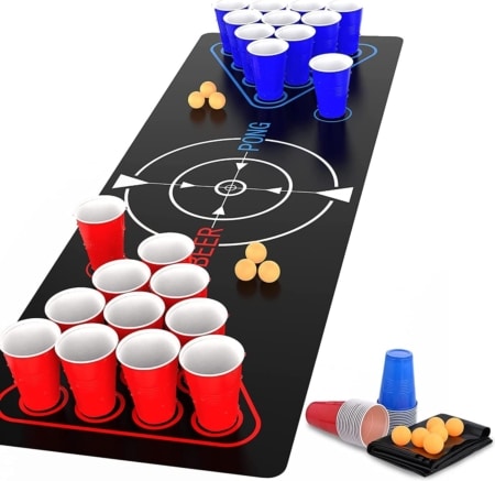 Jogo Beer Pong, com 30 copos, 8 bolas, tapete impermeável 180x60cm por 12€
