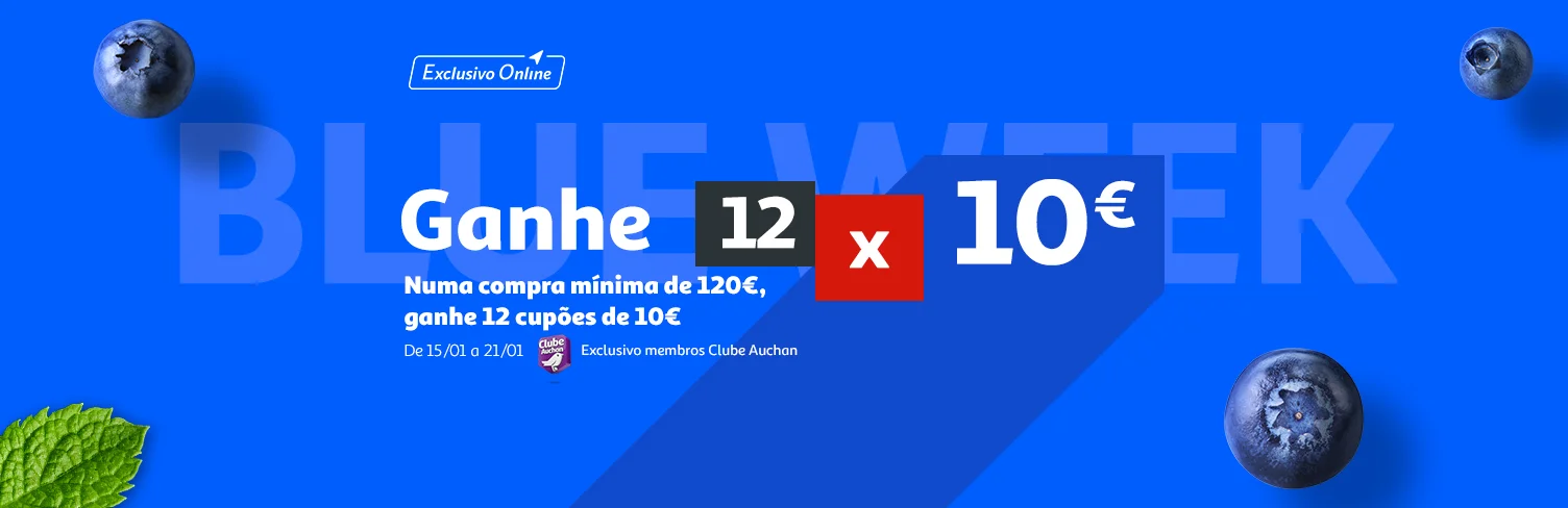 De 15 a 21 de Janeiro, numa encomenda de valor igual ou superior a 120€* em auchan.pt recebe 12 cupões de 10€.
